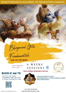 Bhaktivedanta Academy of Education Canada invites you to join this online course – Bhagavad Gita Fundamentals facilitated by HG Damodar Krishna Prabhu. This introductory course is a thematic overview of the philosophical basis of Bhakti as taught in the Bhagavad Gita. This 8 sessions course starts on March 14th 2026 at 7PM to 8PM. It