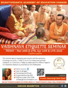 Bhaktivedanta Academy of Education Canada (BAEC) is offering an opportunity to attend an online seminar. BAEC will be conducting ‘The Vaishnava Etiquette Seminar’ on Friday FRIDAY – Mar 20th & 27th, Apr 10th & 17th 2026 starting at 7PM to 9PM. This seminar aims at equipping participants with the necessary knowledge and skills, in order