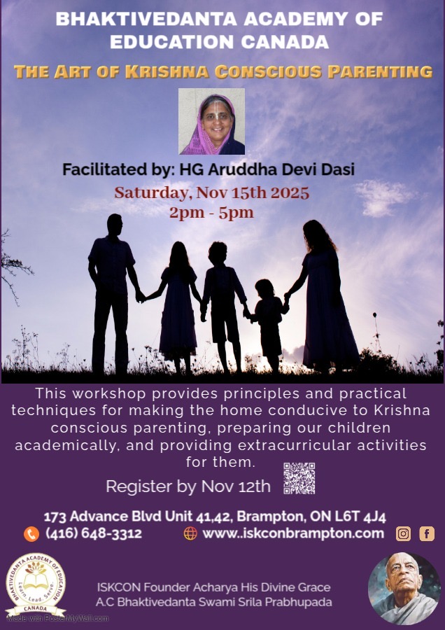 Hare Krishna, Bhaktivedanta Academy of Education Canada invites you to join this Seminar on The Art of Krishna Conscious Parenting. This workshop is for parents, for those planning to enter the grhasta ashram, or for those involved with teaching children in any capacity. About the facilitator HG Aruddha Devi Dasi Please complete registration by Nov …