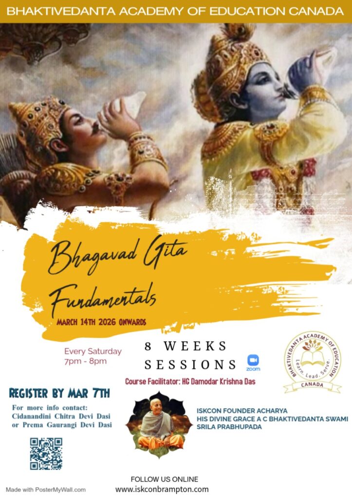 Bhaktivedanta Academy of Education Canada invites you to join this online course – Bhagavad Gita Fundamentals facilitated by HG Damodar Krishna Prabhu. This introductory course is a thematic overview of the philosophical basis of Bhakti as taught in the Bhagavad Gita.